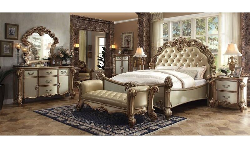 Create an elegant, traditional design in your bedroom with the cherry Vendome dresser. This hand-crafted piece inspired from the luxurious deigns of the past, this five-drawer, two-door dresser features elaborate wood carving details, traditional hardware and a sophisticated style.